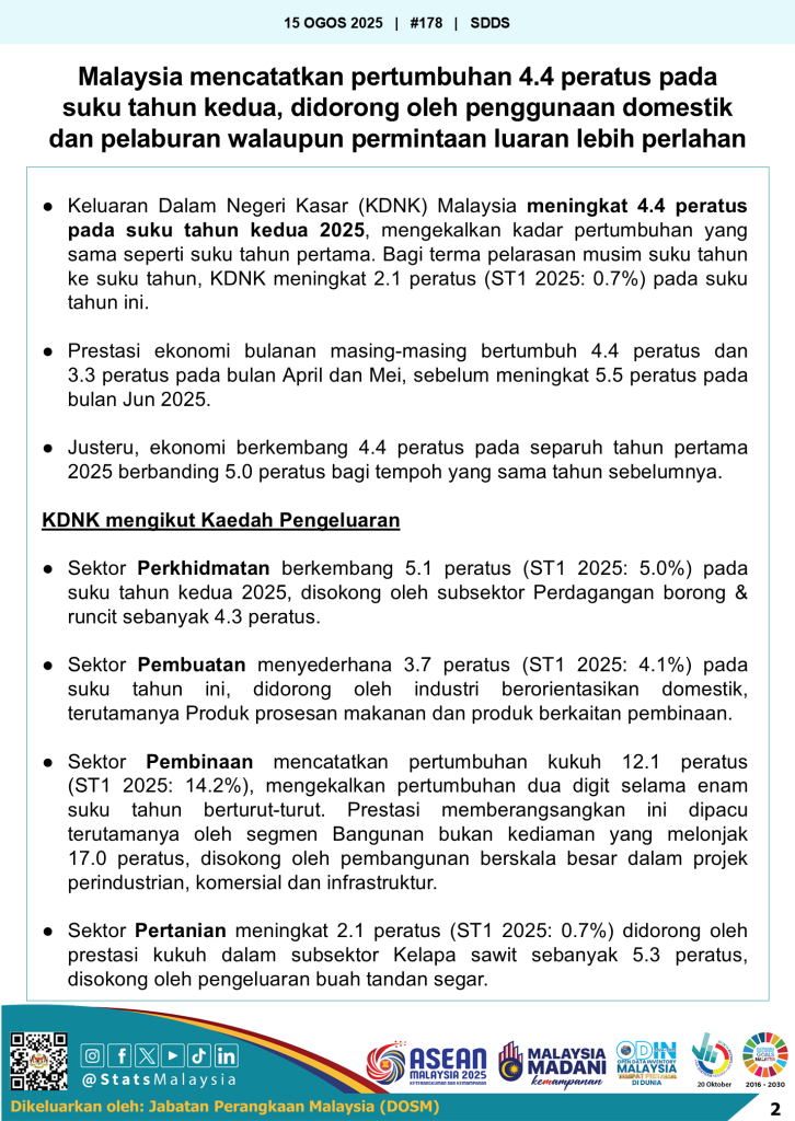 Keluaran Dalam Negeri Kasar (KDNK) Malaysia mencatatkan pertumbuhan 4.4 peratus pada suku kedua 2025, mengekalkan kadar yang sama seperti suku pertama tahun ini. Dari segi pelarasan musim suku ke suku, KDNK meningkat 2.1 peratus berbanding 0.7 peratus pada suku sebelumnya. Mengikut prestasi bulanan, ekonomi berkembang 4.4 peratus pada April, 3.3 peratus pada Mei, dan melonjak kepada 5.5 peratus pada Jun 2025, menjadikan pertumbuhan separuh pertama tahun ini berada pada kadar 4.4 peratus, sedikit rendah berbanding 5.0 peratus yang dicatatkan dalam tempoh sama tahun lalu.