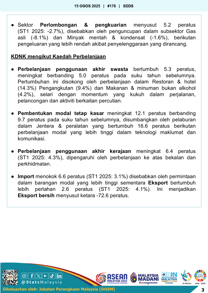 Menurut Ketua Perangkawan Malaysia, Dato’ Sri Dr. Mohd Uzir Mahidin, pertumbuhan suku kedua ini dipacu oleh prestasi kukuh sektor Perkhidmatan, Pembuatan, dan Pembinaan, dengan sokongan kukuh daripada permintaan domestik. Perbelanjaan pengguna yang diperkaya oleh sambutan musim perayaan, aktiviti perjalanan, serta pelaburan dalam projek pembinaan khususnya pusat data, terus mengukuhkan asas pertumbuhan. Faktor seperti pasaran buruh yang stabil, kadar pengangguran rendah, inflasi terkawal, dan bantuan kewangan bersasar turut meningkatkan kuasa beli isi rumah. Walaupun keadaan luaran kekal mencabar akibat ketegangan tarif dan ketidakpastian politik global, ekonomi Malaysia menunjukkan daya tahan yang memberangsangkan.