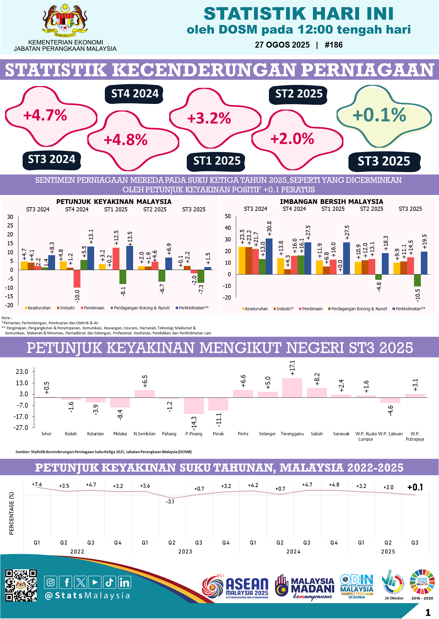 Jabatan Perangkaan Malaysia (DOSM) hari ini mengumumkan penerbitan Statistik Kecenderungan Perniagaan bagi Suku Tahun Ketiga 2025, yang memperlihatkan sedikit penyederhanaan dalam sentimen perniagaan. Petunjuk keyakinan pada suku ini direkodkan pada kadar positif +0.1 peratus, mencerminkan optimisme berterusan meskipun lebih rendah berbanding +2.0 peratus pada suku sebelumnya. Statistik ini, yang berasaskan Survei Kecenderungan Perniagaan suku tahunan, turut memberi gambaran terhadap jangkaan prestasi perniagaan bagi tempoh tiga hingga enam bulan akan datang.