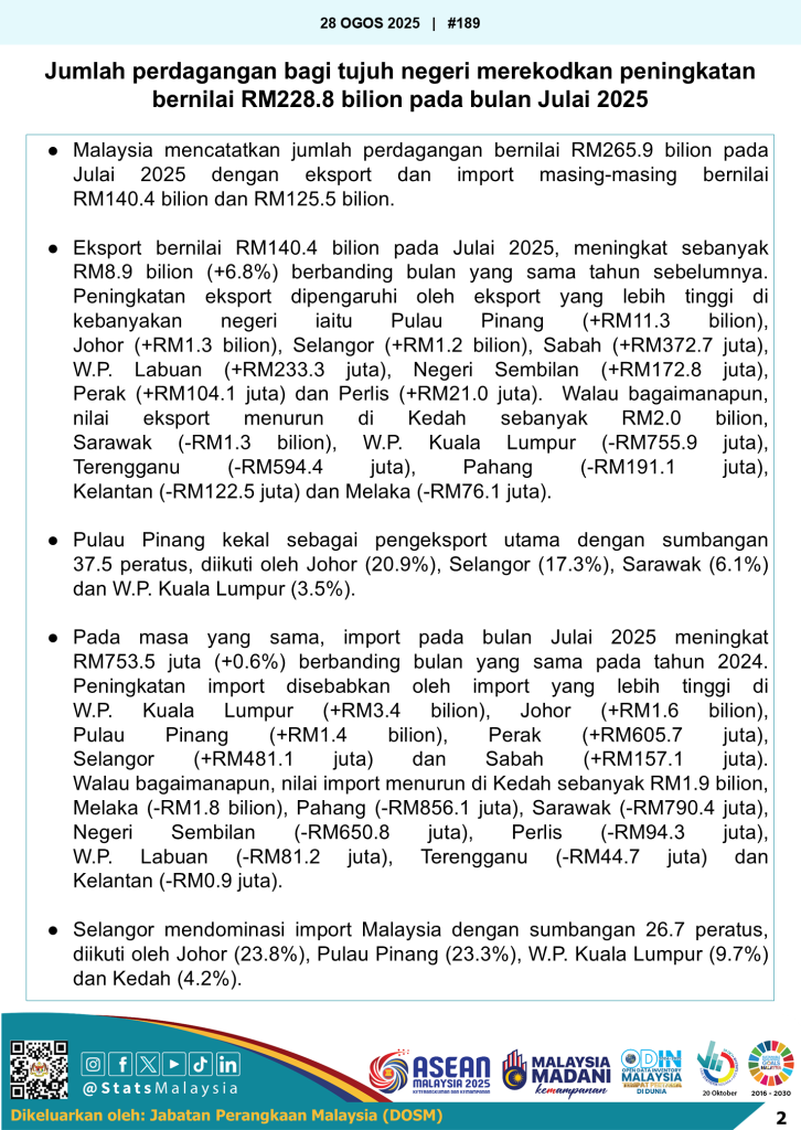 Malaysia mencatatkan jumlah perdagangan bernilai RM265.9 bilion pada Julai 2025, dengan eksport bernilai RM140.4 bilion dan import berjumlah RM125.5 bilion, menurut laporan rasmi Statistik Eksport Import Mengikut Negeri yang dikeluarkan hari ini.