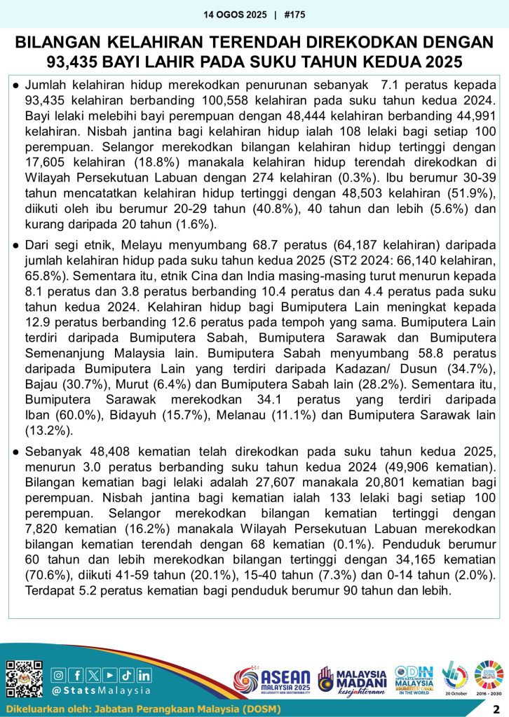 Jabatan Perangkaan Malaysia (DOSM) mengeluarkan laporan terbaharu mengenai Perangkaan Demografi bagi suku tahun kedua 2025, yang memaparkan perkembangan kelahiran hidup, kematian, serta anggaran populasi negara. Ketua Perangkawan Malaysia, Dato’ Sri Dr. Mohd Uzir Mahidin, memaklumkan bahawa jumlah kelahiran hidup mencatatkan penurunan sebanyak 7.1 peratus kepada 93,435 kelahiran berbanding 100,558 kelahiran pada tempoh yang sama tahun lalu. Bayi lelaki mencatatkan jumlah lebih tinggi iaitu 48,444 kelahiran berbanding 44,991 kelahiran bayi perempuan, dengan nisbah jantina 108 lelaki bagi setiap 100 perempuan. Selangor merekodkan kelahiran tertinggi sebanyak 17,605 bayi, manakala Wilayah Persekutuan Labuan mencatatkan jumlah terendah dengan hanya 274 kelahiran. Dari segi umur ibu, kumpulan 30 hingga 39 tahun mendominasi dengan 51.9 peratus kelahiran, diikuti ibu berumur 20 hingga 29 tahun, 40 tahun ke atas, dan bawah 20 tahun. Secara purata, pada suku tahun kedua 2025, seorang bayi dilahirkan setiap minit di Malaysia.