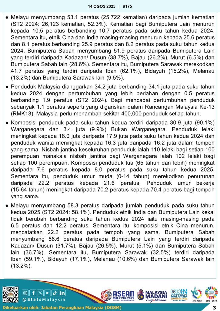 Jumlah penduduk Malaysia dianggarkan berjumlah 34.2 juta orang, meningkat sedikit berbanding 34.1 juta tahun lalu, namun kadar pertumbuhan hanya 0.5 peratus, jauh lebih perlahan daripada 1.9 peratus pada tempoh sama 2024. Daripada jumlah tersebut, 90.1 peratus adalah warganegara dan 9.9 peratus bukan warganegara. Komposisi penduduk menunjukkan 8.0 peratus adalah warga emas berumur 65 tahun ke atas, manakala penduduk muda bawah 14 tahun berkurang kepada 21.6 peratus. Penduduk umur bekerja kekal dominan pada kadar 70.4 peratus.