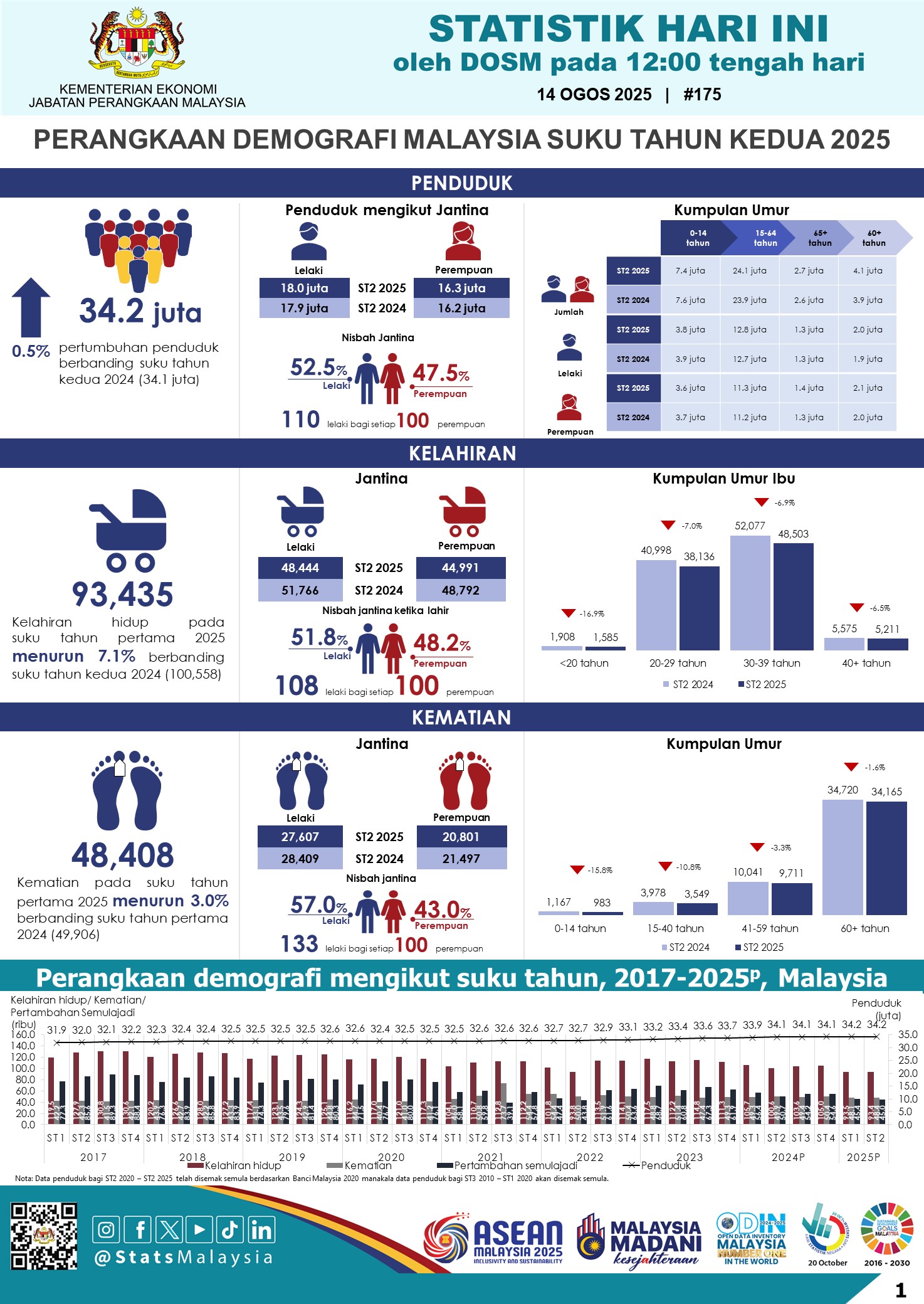 Jabatan Perangkaan Malaysia (DOSM) mengeluarkan laporan terbaharu mengenai Perangkaan Demografi bagi suku tahun kedua 2025, yang memaparkan perkembangan kelahiran hidup, kematian, serta anggaran populasi negara. Ketua Perangkawan Malaysia, Dato’ Sri Dr. Mohd Uzir Mahidin, memaklumkan bahawa jumlah kelahiran hidup mencatatkan penurunan sebanyak 7.1 peratus kepada 93,435 kelahiran berbanding 100,558 kelahiran pada tempoh yang sama tahun lalu. Bayi lelaki mencatatkan jumlah lebih tinggi iaitu 48,444 kelahiran berbanding 44,991 kelahiran bayi perempuan, dengan nisbah jantina 108 lelaki bagi setiap 100 perempuan. Selangor merekodkan kelahiran tertinggi sebanyak 17,605 bayi, manakala Wilayah Persekutuan Labuan mencatatkan jumlah terendah dengan hanya 274 kelahiran. Dari segi umur ibu, kumpulan 30 hingga 39 tahun mendominasi dengan 51.9 peratus kelahiran, diikuti ibu berumur 20 hingga 29 tahun, 40 tahun ke atas, dan bawah 20 tahun. Secara purata, pada suku tahun kedua 2025, seorang bayi dilahirkan setiap minit di Malaysia.
