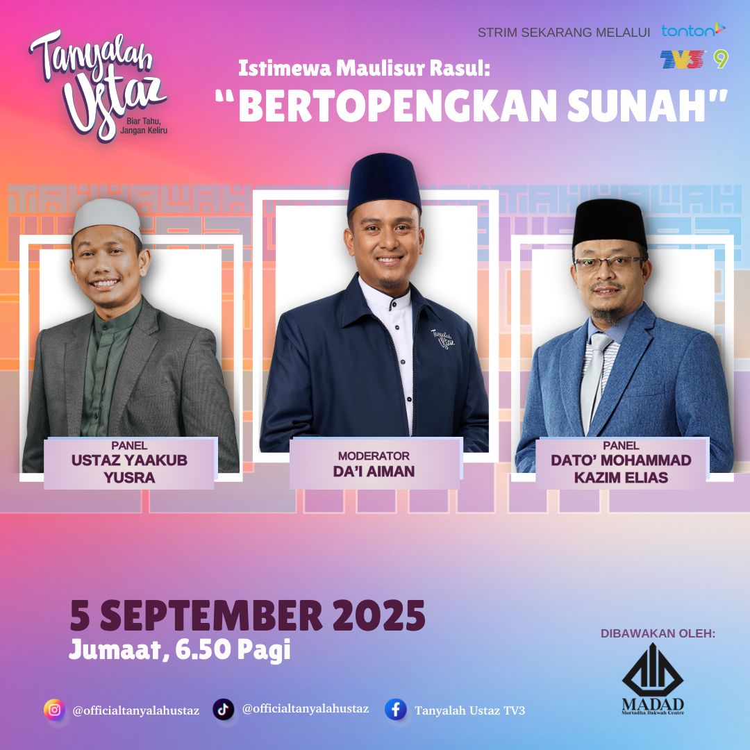 Tanyalah Ustaz menjadi sorotan utama kempen dengan imej baharu melalui episod khas bertajuk “Bertopengkan Sunah.” Episod ini menyingkap isu penyalahgunaan salasilah Rasulullah SAW untuk tujuan kepentingan individu, kelompok dan ideologi tertentu, termasuk manipulasi hadis palsu bagi menghalalkan amalan yang bertentangan dengan ajaran Islam sebenar. Perbincangan yang dijadualkan bersiaran pada 5 September 2025, jam 6.50 pagi di TV3 dan TV9 ini menampilkan Datuk Ustaz Kazim Elias bersama Ustaz Yaakub Yusra sebagai panelis, menjadikan ia sebuah wacana ilmiah yang padat dengan peringatan serta pencerahan.