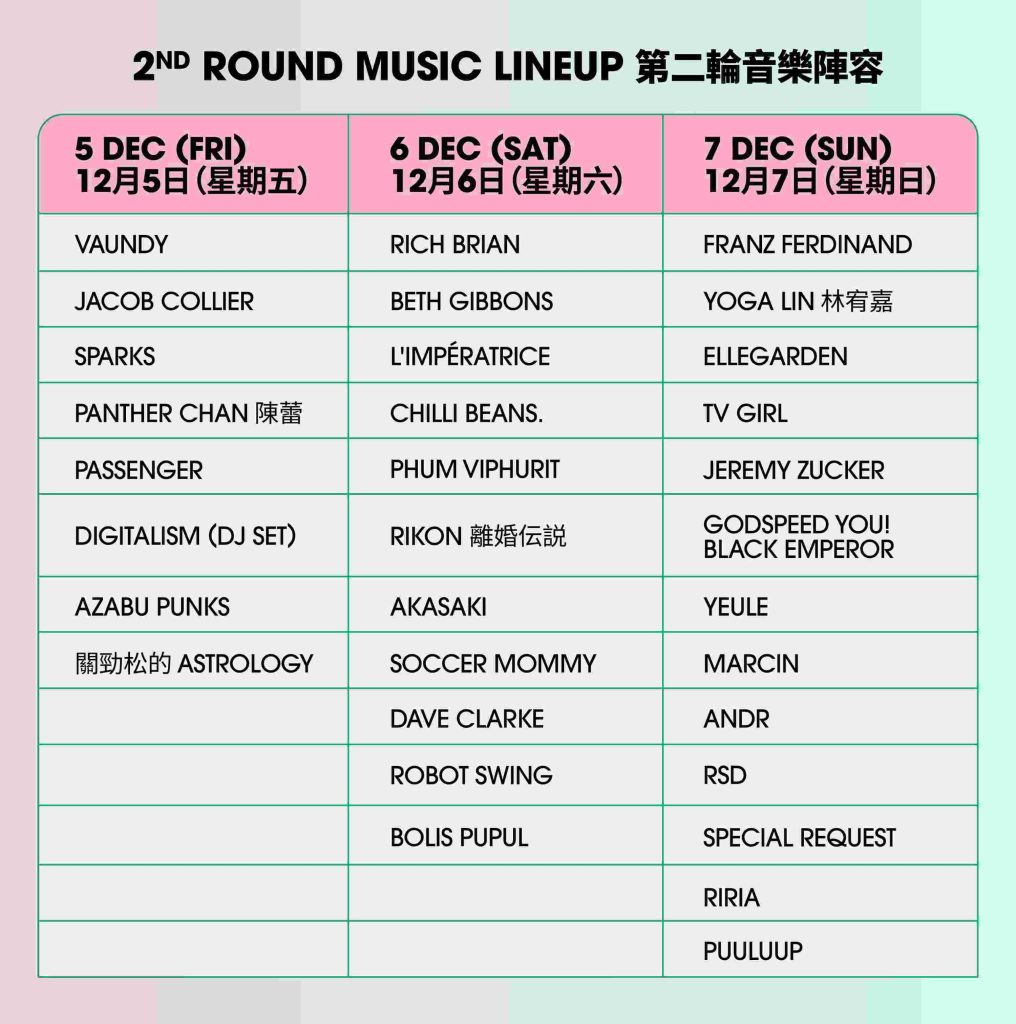 These new names join an already star-studded roster announced earlier, including Passenger, Jacob Collier, Digitalism (DJ Set), and Panther Chan (Friday); Rich Brian, Beth Gibbons, Soccer Mommy, Chilli Beans., and Phum Viphurit (Saturday); and Franz Ferdinand, Yoga Lin, Godspeed You! Black Emperor, TV Girl, and Riria (Sunday).